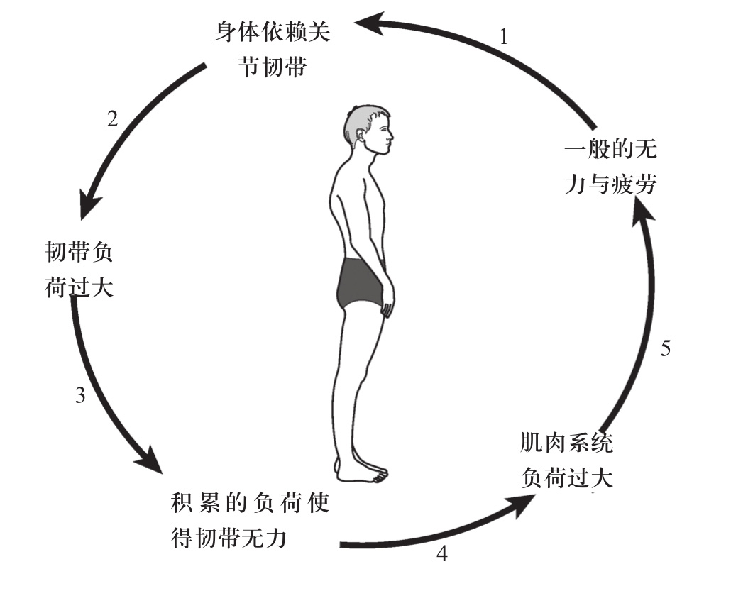 自然姿势的主要问题在于骨骼肌系统肌力不足,出现功能失衡,使得起支撑功能的韧带负荷过大,结果导致恶性循环,对一般姿势带来负面的影响(图3.17)。