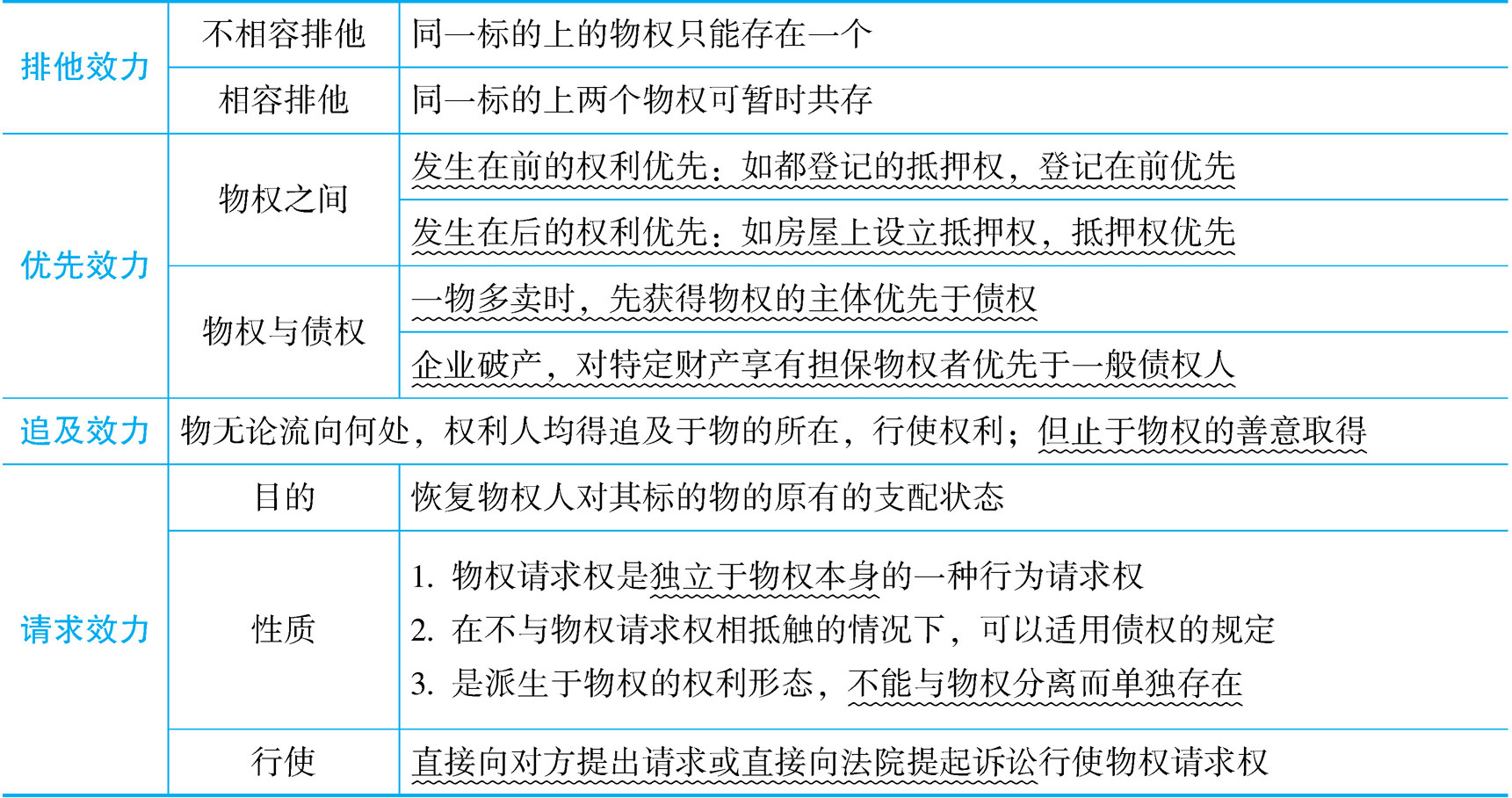 物权具有 优先效力、追及效力、排他效力 ,而债权则没有这些效力,具有平等性、相容性。对此,将在物权的效力部分详述。