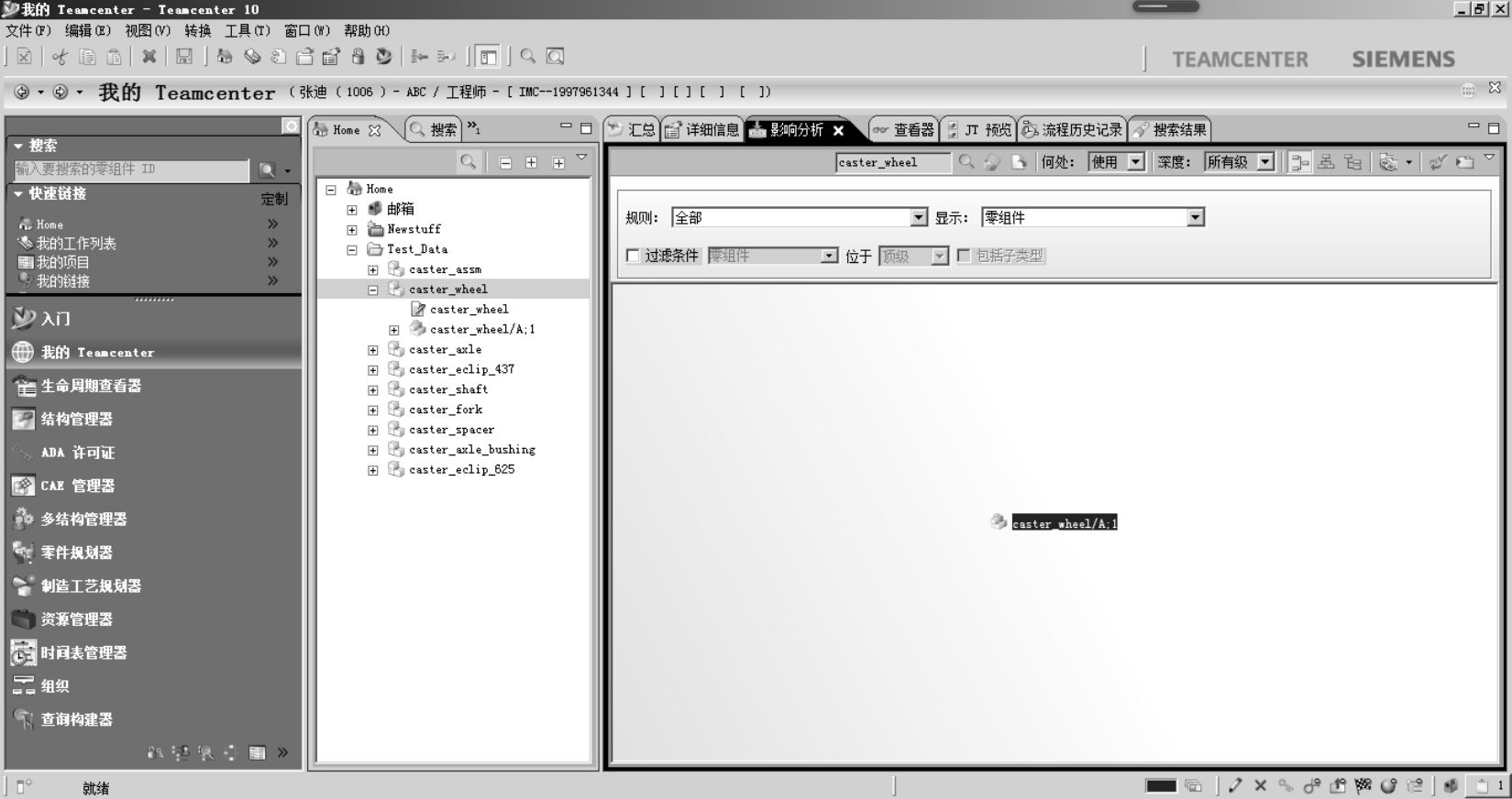 :只能对有删除权限的数据删除,包括对文件夹、零组件和数据集的删除,如果不能删除,说明该数据对象被引用,查看引用的方法是在“My Teamcenter”中选择需删除的数据,选择Referencers面板,选择Where:Referenced,双击窗口中需要删除的数据对象,便可查看该数据对象的引用信息。