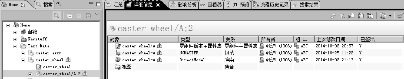 (4)选择Item/Item Revision,单击Details面板,查看签出列中有