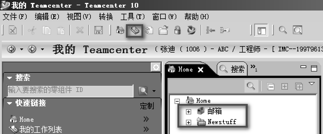 Teamcenter系统给每个用户创建几个默认的文件夹,如图2-18所示。Home是用户的根文件夹;Newstuff 是系统默认的存放临时对象的文件夹;Mailbox 是邮箱文件夹,是用户接收由其他 Teamcenter 用户发送的邮件的地方,用户账号创建以后,将自动在 Home 文件夹下创建个人邮箱;我的工作列表是进行流程任务跟踪和执行的容器,存储审批过程中的流程信息。其下的Tasks to perform虚拟文件夹为需要用户参与的流程任务,Tasks To track虚拟文件夹为由用户发起(负责)的任务,可以查看流程的执行状态。