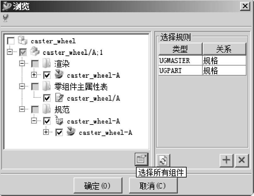 (2)弹出“签入”对话框,如果需要签入Item Revision下的其他对象,选择“浏览选定组件”,以下操作同签出操作,这里不再赘述。