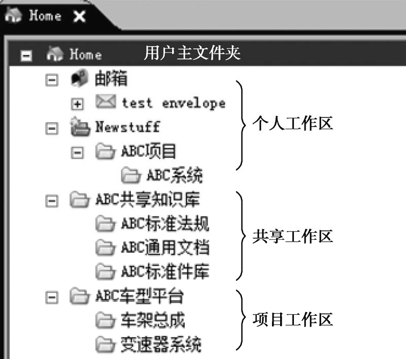 每个 Teamcenter 的用户登录系统后,都会有一个工作区(Workspace)可存放数据。根据数据的类型,我们建议用户以如下的结构形式组织工作区中的数据,即将工作区分为“个人工作区”“共享工作区”和“项目工作区”,如图2-32所示。