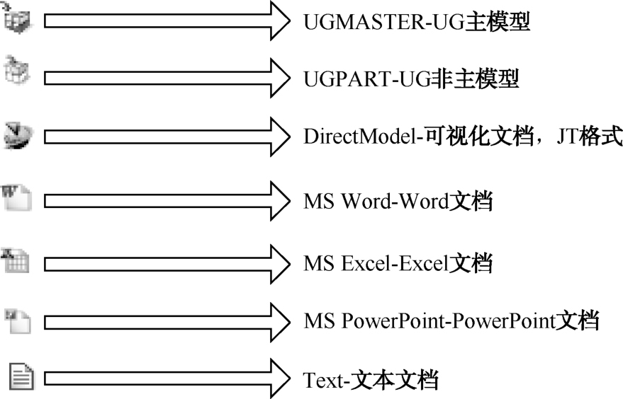 数据集是用来管理(存放)应用软件生成的数据(文件)的一种对象,对应于不同类型(格式)的数据(文件),Teamcenter提供Dataset Type与之对应。常用的Dataset类型如图2-15所示。