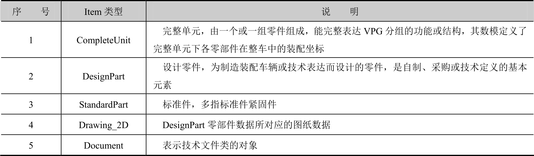 根据ABC汽车企业零部件的分类情况,在Teamcenter系统中定义几种不同的Item类型,同时使用Document类型的Item来管理技术文件,其名称和描述如表2-1所示。