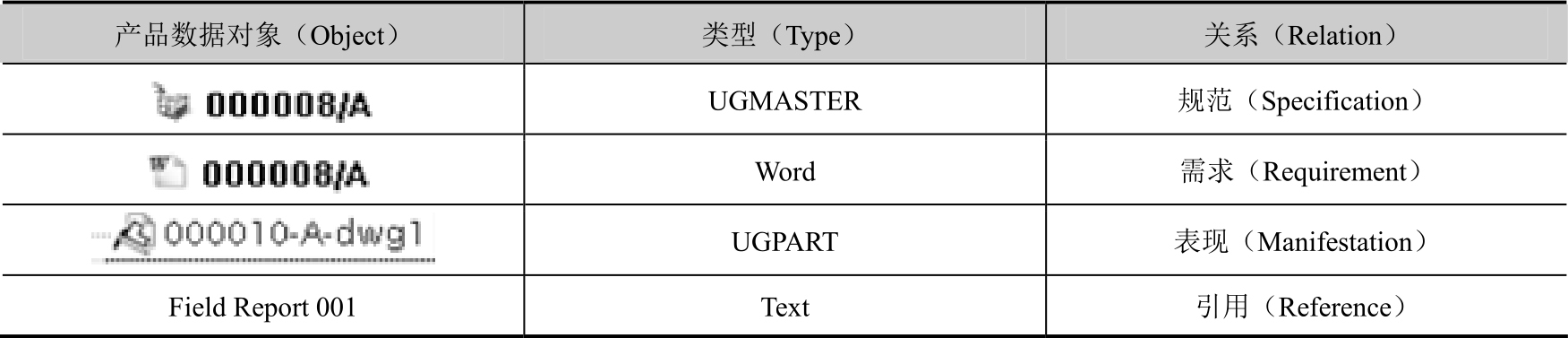 表现关系是在某特殊时刻“零组件”或“零组件修订版”的某特殊方面未定义的快照。例如,“数值控制(NC)”程序文件就是一个普通表示。我们认为它表示“零组件修订版”的某个方面(如加工信息),而且,只有该“零组件修订版”未更改时,此信息才是准确的。“零组件修订版”一旦改变,NC 程序文件就可能不再准确,且可能需要重新创建,如表2-2所示。