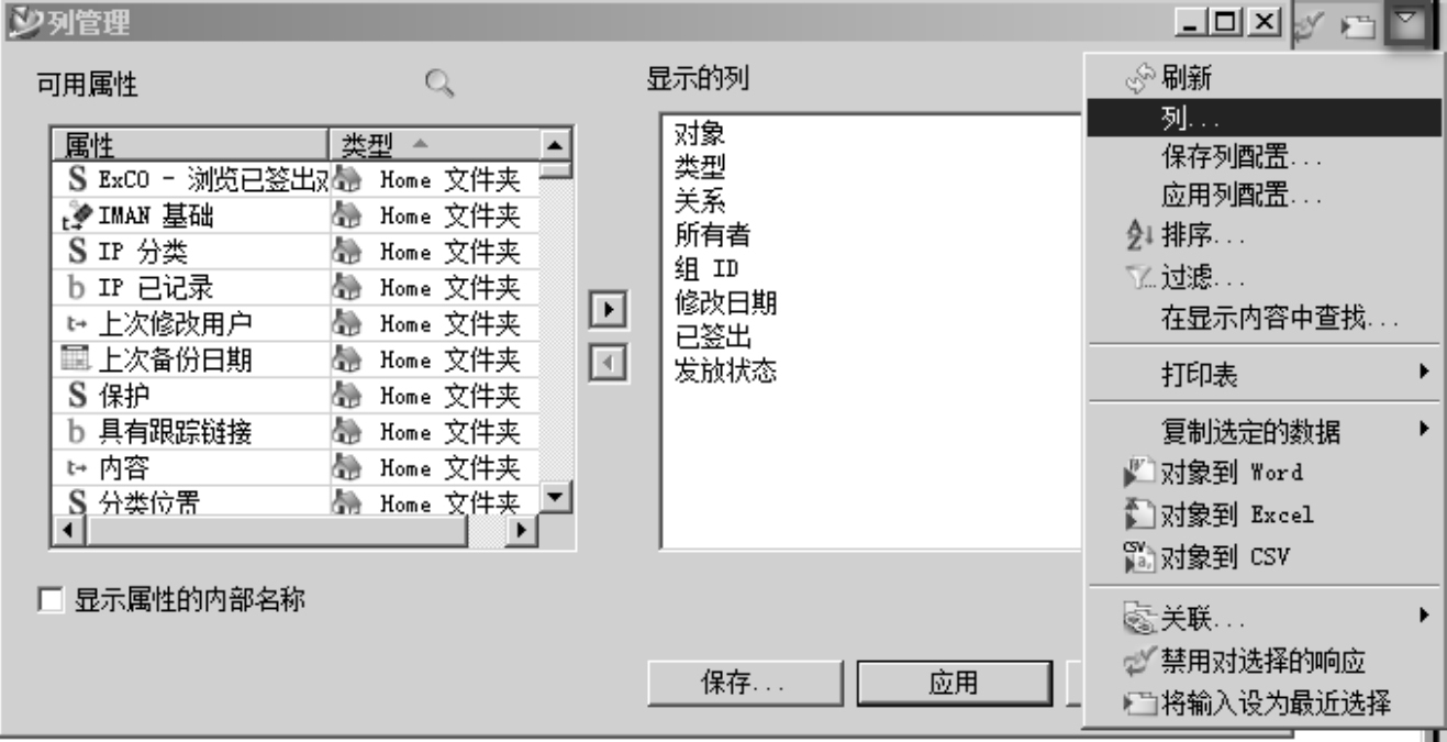 选择“详细信息”视图,页面将以列表的形式显示选中对象包含的所有信息,“关系”列的信息显示了所选对象与其下各个对象间关系的名称,如图2-30所示。单击窗口右侧的“视图菜单”项,在弹出的下拉列表中单击“列”选项,并根据需要在“列管理”对话框中添加其他对象属性,如图2-31所示。