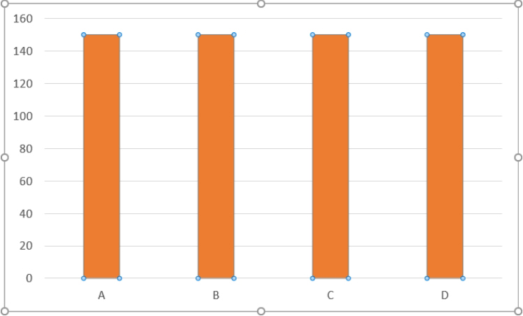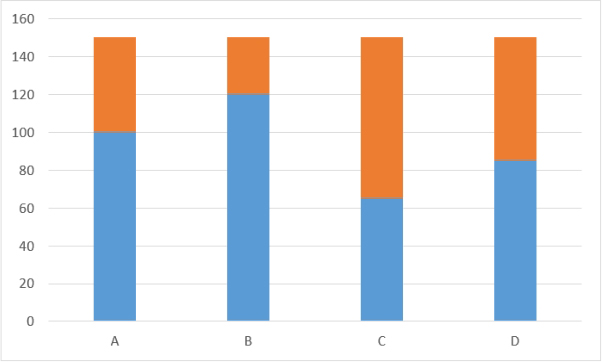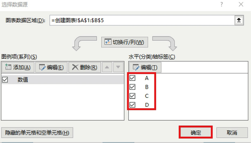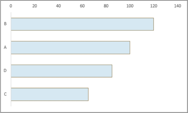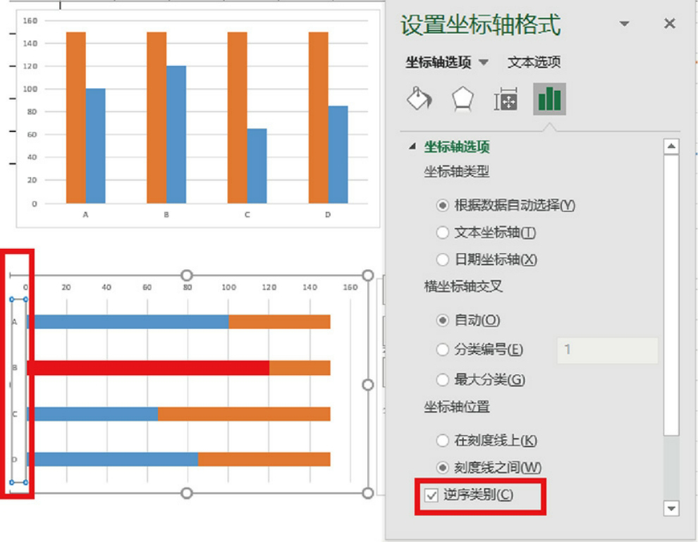 与柱形图相比,转化来的条形图有一些不同。在柱形图中,纵坐标轴的系列标签为“A,B,C,D”,而转化为条形图后系列标签顺序为“D,C,B,A”,因此需要将纵坐标的顺序进行调整。