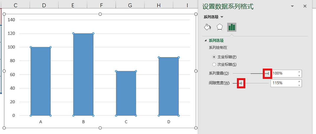 当调整“系列重叠”时好像没有发生变化,这是因为目前只有一组数据系列,无法显示出变化。为了展示“系列重叠”对柱形图的影响,可以为数据源补充一组数据。