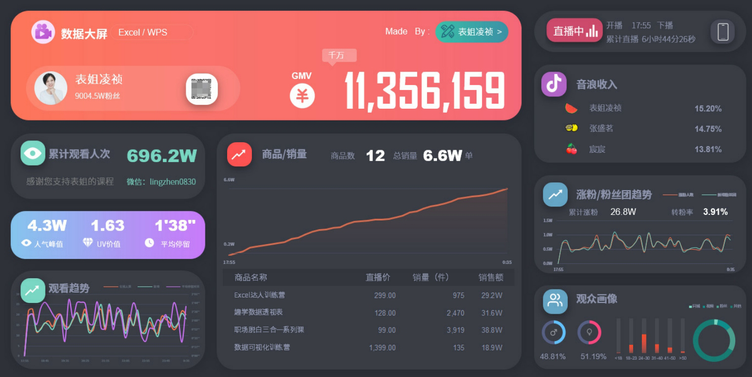 第10章介绍的“直播数据大屏可视化看板”同样利用了这个原理,由于作图用的数据源是动态变化的,图表与其联动变化,形成一个大屏可视化动态看板。其中,对于动态数据源可以利用RANDBETWEEN随机函数进行模拟,当刷新数据源时,数据会更新变化,形成动态的数据源。