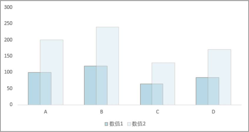 这样调整两组数据的上下顺序后,如图2-15所示,“橙色柱子”显示在“蓝色柱子”下方,“蓝色柱子”就显示出来了。