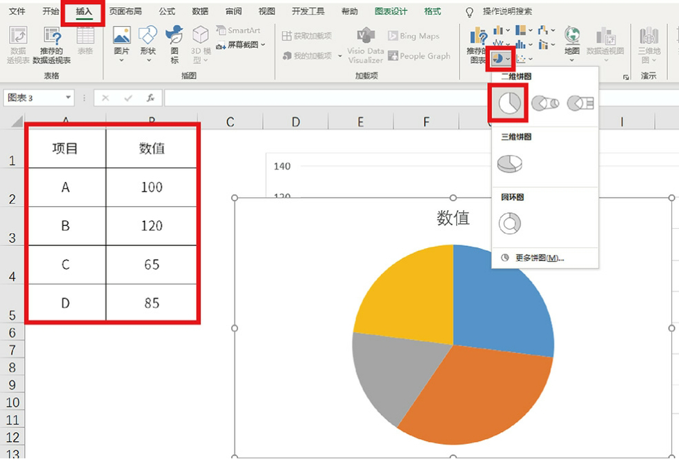 选中“A1:B5”单元格区域并选择“插入”选项卡,单击“插入饼图或圆环图”下拉按钮,选择“饼图”选项,如图2-8所示,即可完成饼图图表的创建。