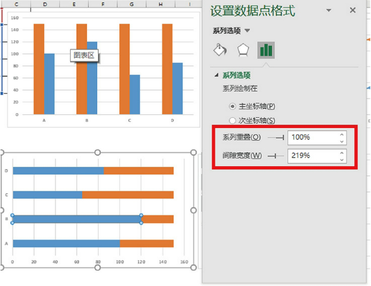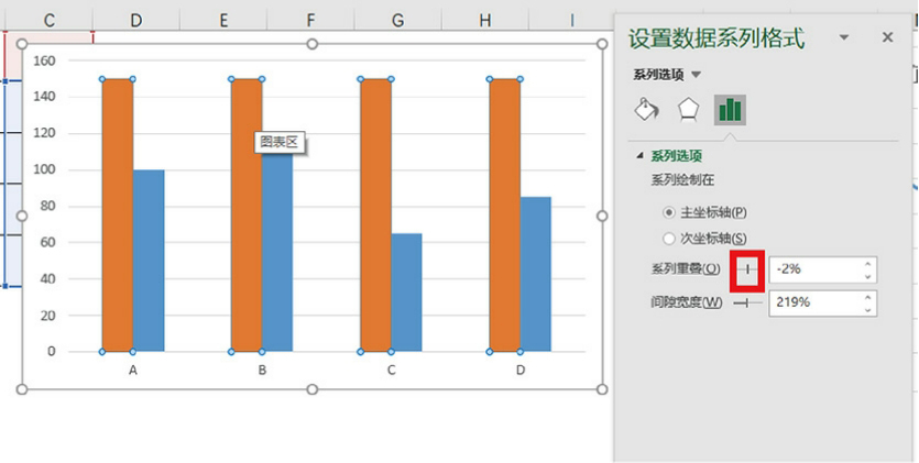 当柱形图具有两组数据后,就可以通过对“系列重叠”进行调整来观察它对柱形图的影响。向左拖曳“系列重叠”旁边的滑块,“橙色柱子”与“蓝色柱子”就会分离,将“系列重叠”调整为“100%”,“橙色柱子”与“蓝色柱子”又会重叠在一起,如图2-16所示。