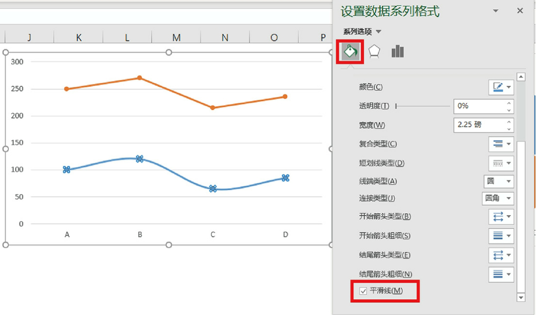 此外,折线图在线条的设置上也有一个小细节——可以将线条设置为平滑线。选中“蓝色”折线并选择“填充与线条”选项,勾选“平滑线”复选框,如图2-22所示,折线图的线条过渡就变得更加柔和了。