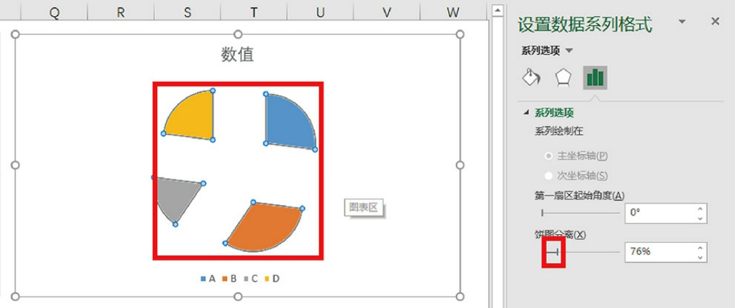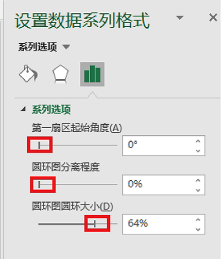 到这里就完成了饼图到环形图的转换,并且环形图与饼图一样,在“设置数据系列格式”工具箱中可以对其“第一扇区起始角度”和“圆环图分离程度”进行设置。此外,通过“圆环图圆环大小”的设置,可以控制圆环的薄厚,如图2-38所示。