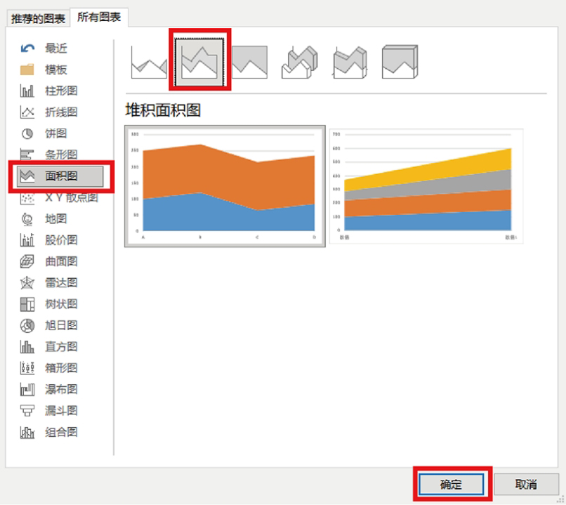 首先选中前面复制的折线图,然后选择“图表设计”选项卡,单击“更改图表类型”按钮。在弹出的“更改图表类型”对话框中选择“面积图”选项,接着选中“堆积面积图”选项,最后单击“确定”按钮,此时即可将折线图转变为条形图,如图2-34所示。
