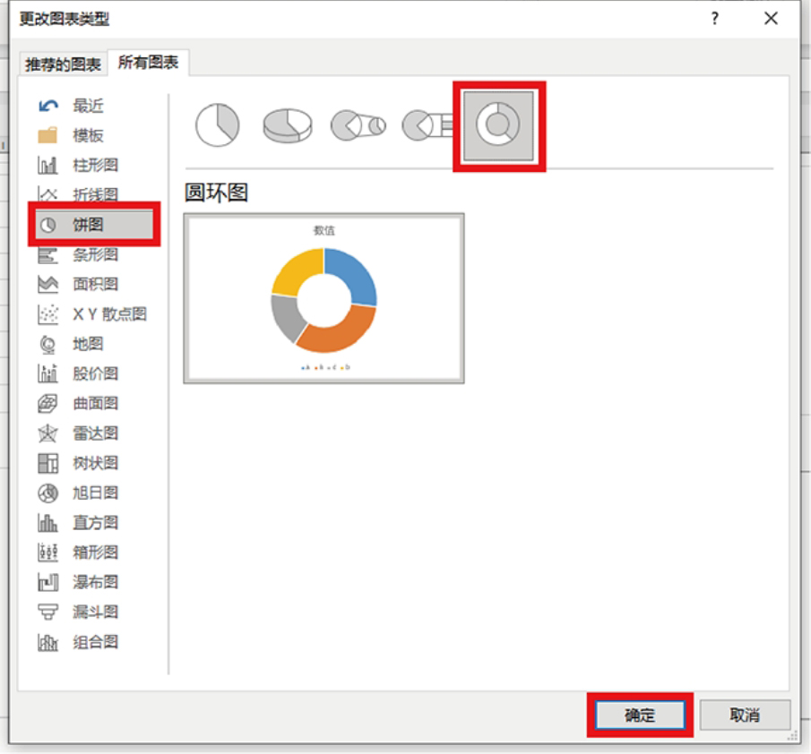那么饼图又是如何转变为环形图的呢?首先选中复制的饼图图表,然后选择“图表设计”选项卡,单击“更改图表类型”按钮,在弹出的“更改图表类型”对话框中选择“饼图”选项,接着选中“圆环图”选项,最后单击“确定”按钮,如图2-37所示。