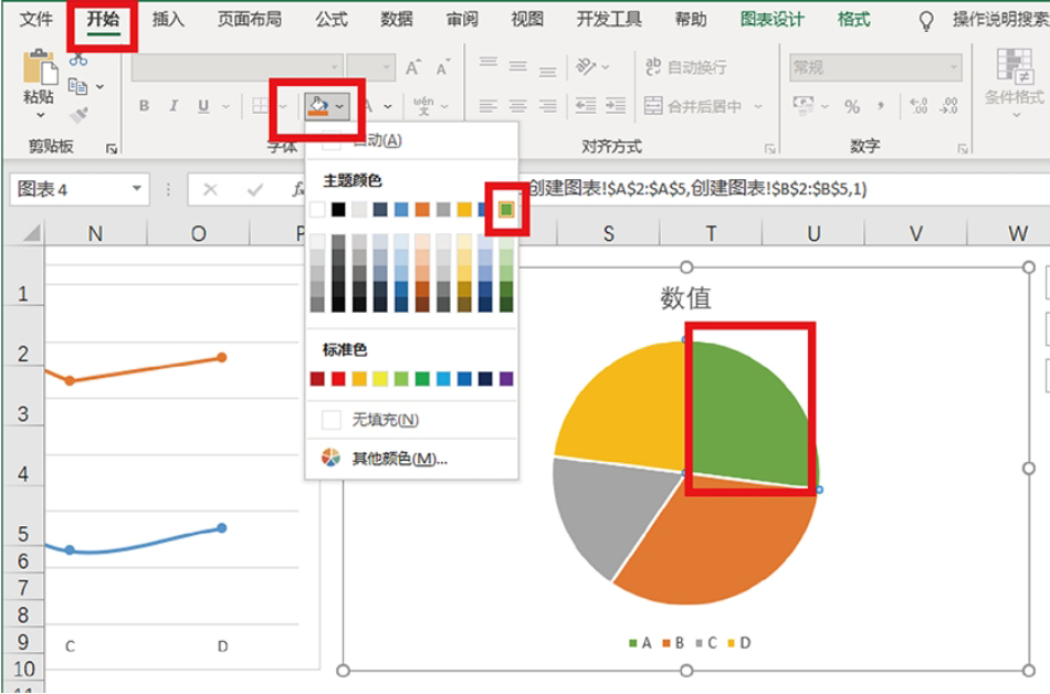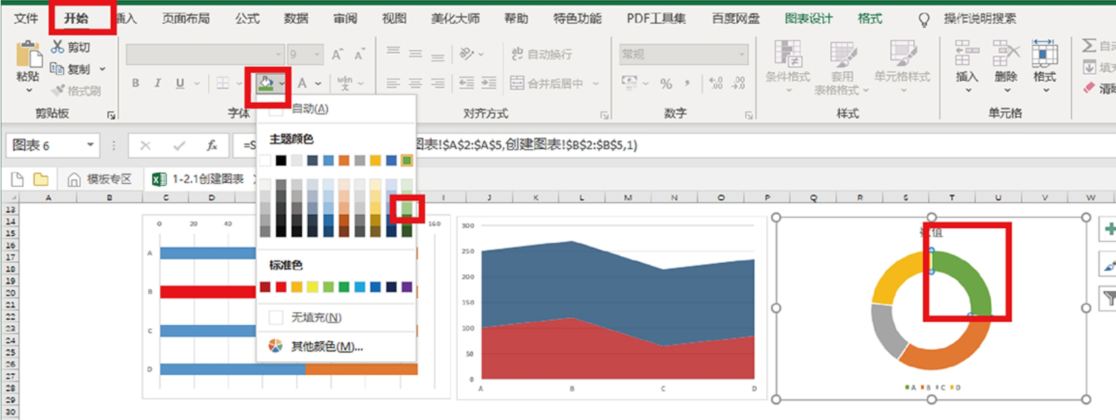 环形图的颜色设置与饼图一样,可以对其中一个扇区进行设置。选中环形图后,在其中一个扇区上再次单击,选择“开始”选项卡,在“填充颜色”下拉列表中选择合适的颜色进行设置,如图2-39所示。
