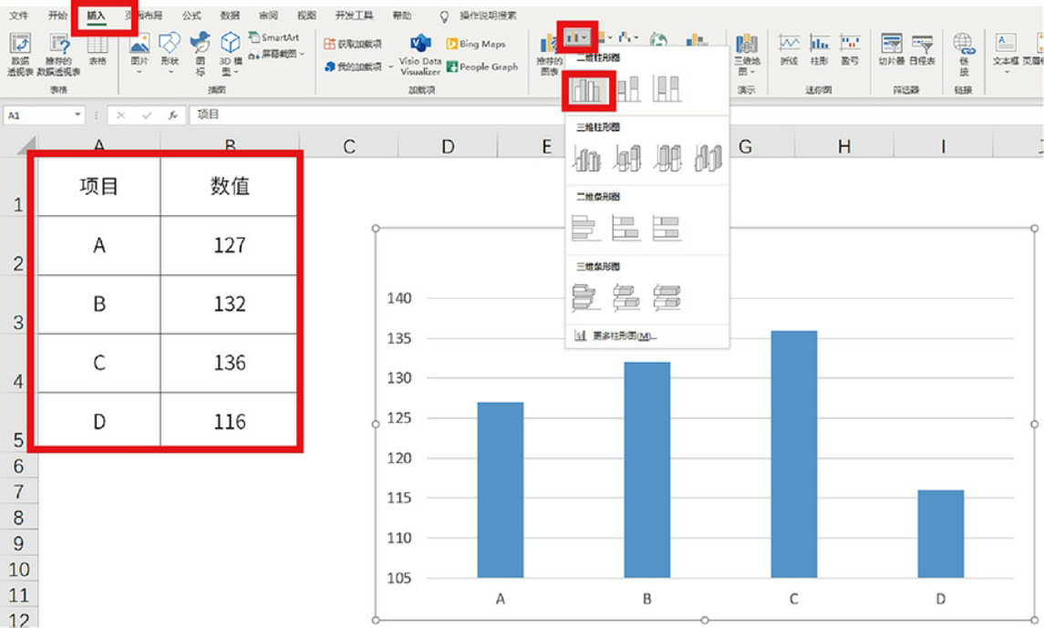 打开本书配套的“2.1-创建图表”源文件,在“创建图表”工作表中选中“A1:B5”单元格区域并选择“插入”选项卡,单击“插入柱形图或条形图”按钮,选择“簇状柱形图”选项,如图2-1所示,即可完成柱形图的创建。