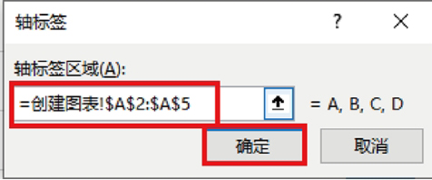 此时图表的系列名称为“1,2,3,4,5”,而真正的数据名称应为“A,B,C,D”。接下来调整系统名称。在“选择数据源”对话框中单击“编辑”按钮,在弹出的“轴标签”对话框中选中“A2:A5”单元格区域,单击“确定”按钮,如图2-3所示。在返回的“选择数据源”对话框中,可以看到“水平(分类)轴标签”列表框中系列名称已经被修改为“A,B,C,D”,单击“确定”按钮,如图2-4所示。