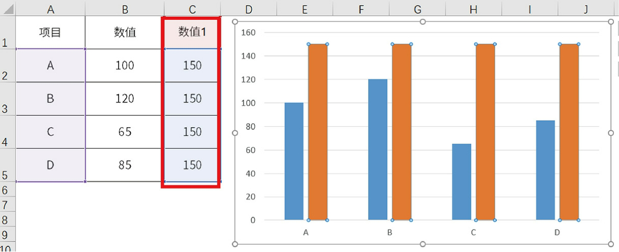 下面为图表添加一组数据。先选中“B1:B5”单元格区域,按“Ctrl+C”组合键执行复制操作,然后选中“C1:C5”单元格区域,按“Ctrl+V”组合键执行粘贴操作。将“C1”单元格的“数值”修改为“数值1”,将“C2:C5”单元格区域的数据都修改为“150”。