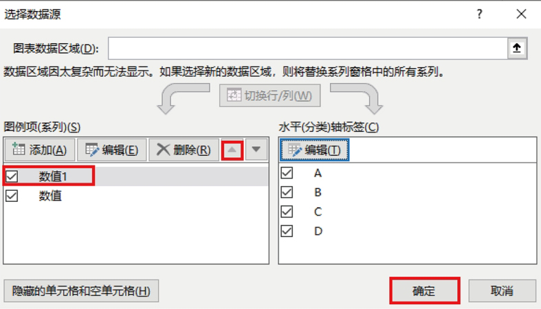 调整两组数据的顺序,将“橙色柱子”显示在下方。选中柱形图并选择“图表设计”选项卡,在弹出的“选择数据源”对话框中单击“选择数据”按钮。接着在弹出的“选择数据源”对话框中选中“数值1”选项,单击