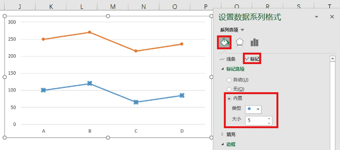 对于折线图的基本设置,笔者从线条和标记两个角度进行了介绍,标记就是对折线中的圆点进行的设置与修改,线条则是对折线进行的设置。