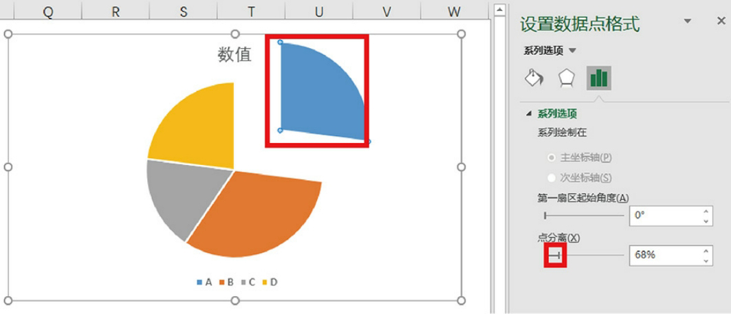 除了“第一扇区起始角度”,当单独选中“蓝色扇区”时,右侧工具箱变为“设置数据点格式”工具箱,这时拖曳“点分离”下方的滑块,如图2-26所示,“蓝色扇区”就会被单独分离出去。