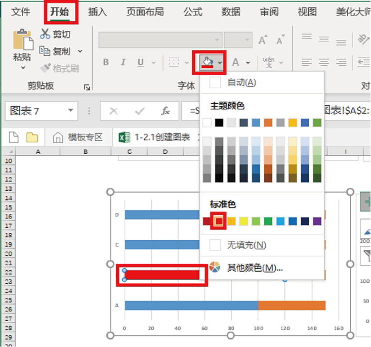 对颜色的填充也一样,选中一个条形,选择“开始”选项卡并单击“颜色填充”下拉按钮,可以设置此条形的填充颜色,选中整个条形图可以设置整个条形图的填充颜色,如图2-31所示。