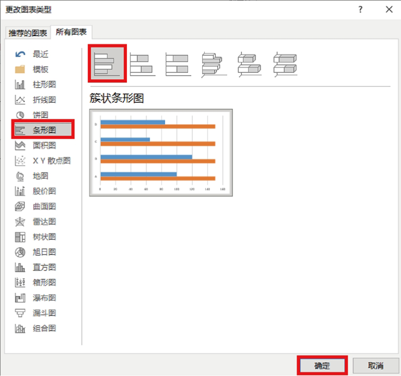 将柱形图演变为条形图。选中柱形图并选择“图表设计”选项卡,单击“更改图表类型”按钮,在弹出的“更改图表类型”对话框中选择“条形图”中的“簇状条形图”选项,单击“确定”按钮,如图2-29所示。