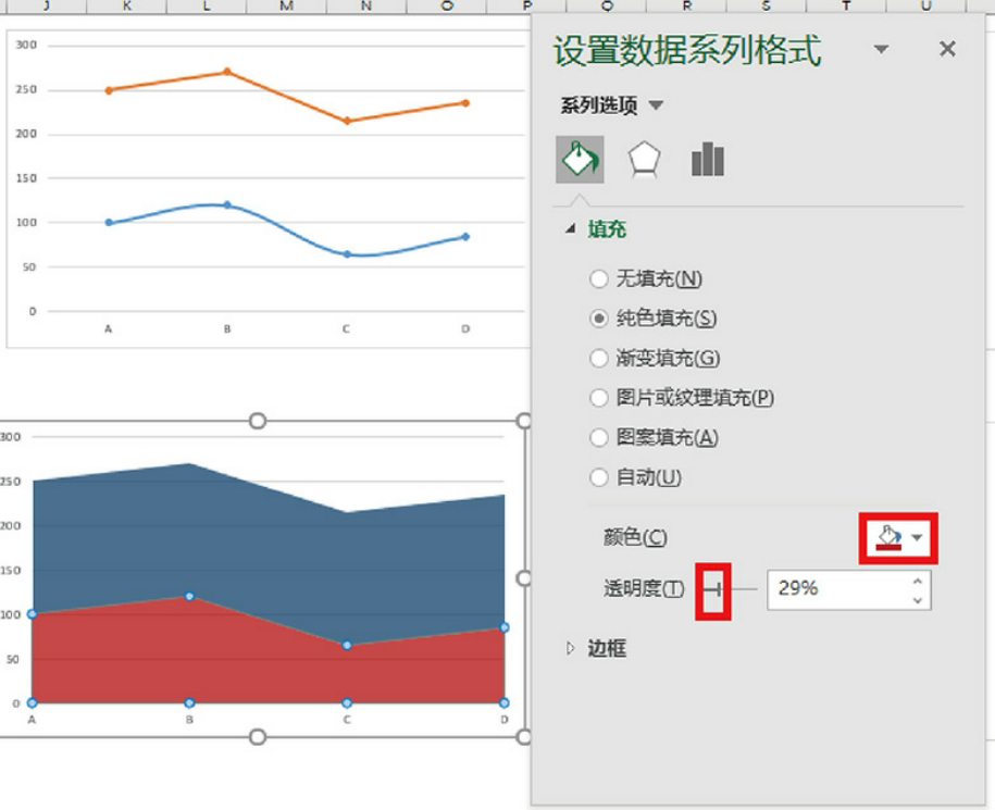 选中“橙色”面积部分,在右侧“设置数据系列格式”工具箱中的“颜色”下拉列表中选择颜色为“蓝色”,通过拖曳“透明度”旁边的滑块调整其透明度。