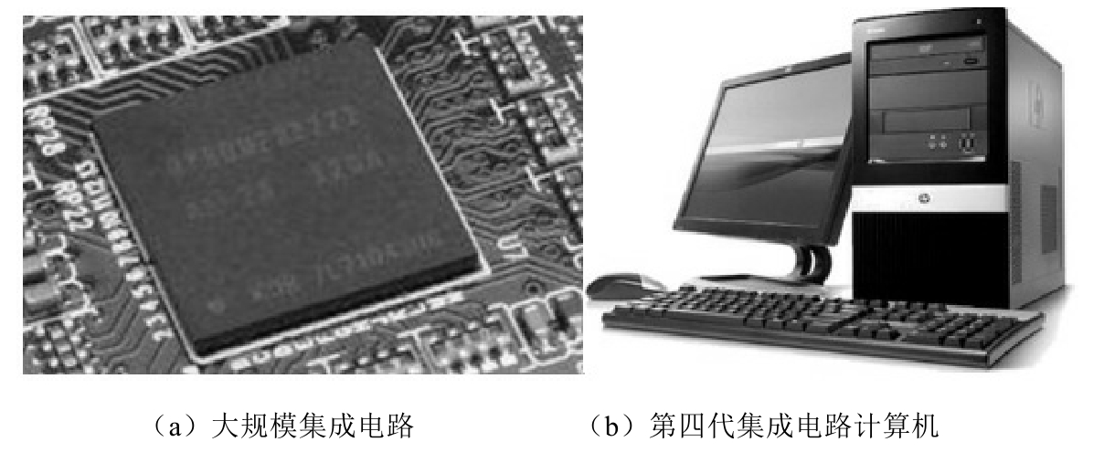 第四代是大规模和超大规模集成电路(见图2-4)。1970年,IBM公司将采用大规模集成电路的大型计算机370系列投放市场。此后诞生了各种各样的微处理器,而个人计算机(PC)的出现将信息技术真正带到了工业领域乃至进入千家万户。新的电子产品如雨后春笋,潮水般涌向市场,这个势头方兴未艾。