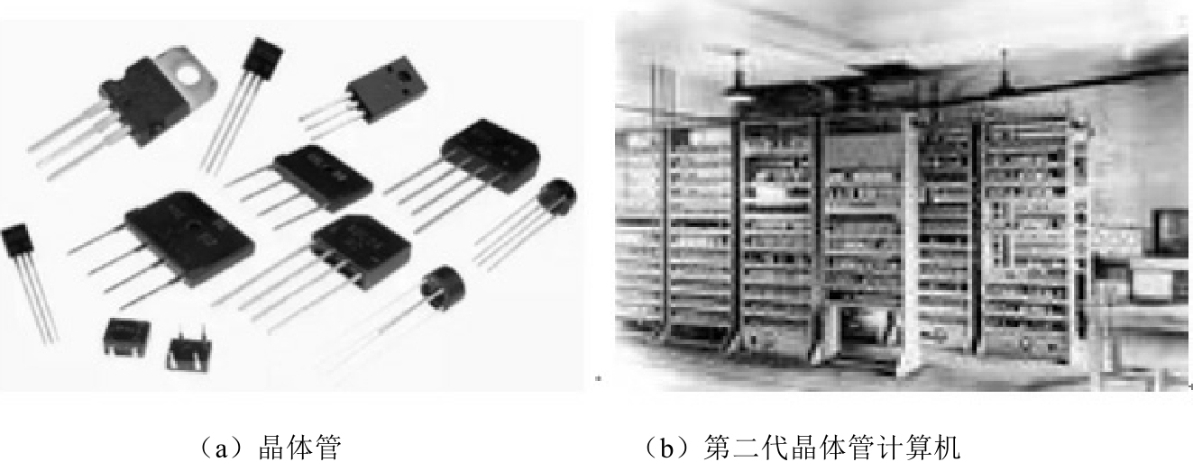 第二代基本元器件是晶体管(见图2-2)。1954年,美国贝尔实验室成功研制第一台使用晶体管线路的计算机,取名为“催迪克”(Transistorized Airborne Digital Computer,TRADIC),装有800个晶体管。晶体管不仅能实现电子管的功能,还具有尺寸小、重量轻、寿命长、效率高、发热少、功耗低等优点。使用晶体管后,电子线路的结构大大改观,制造高速电子计算机就更容易实现了。