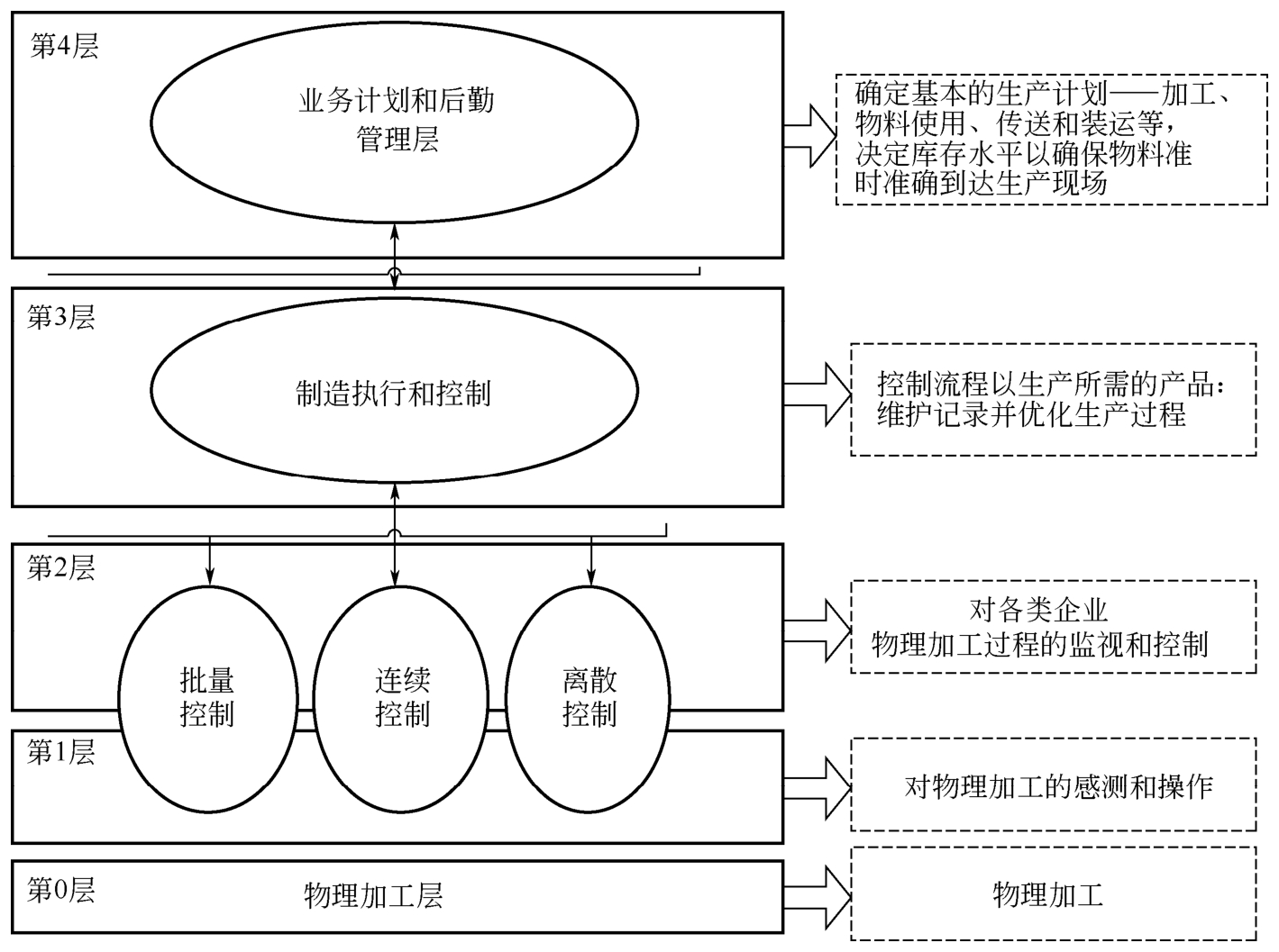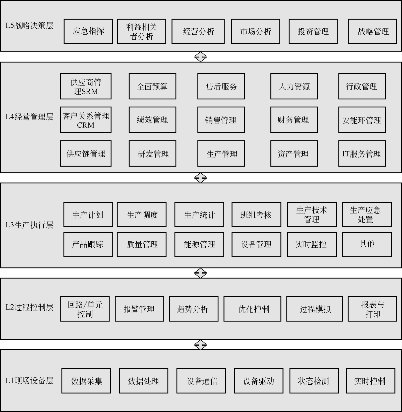 从需求出发,在计算机网络环境的支持下,通过数据集成服务构建制造业企业信息化集成系统。自下而上划分为现场设备层、过程控制层、生产执行层、经营管理层和战略决策层,其基本功能构成如图2-8所示。