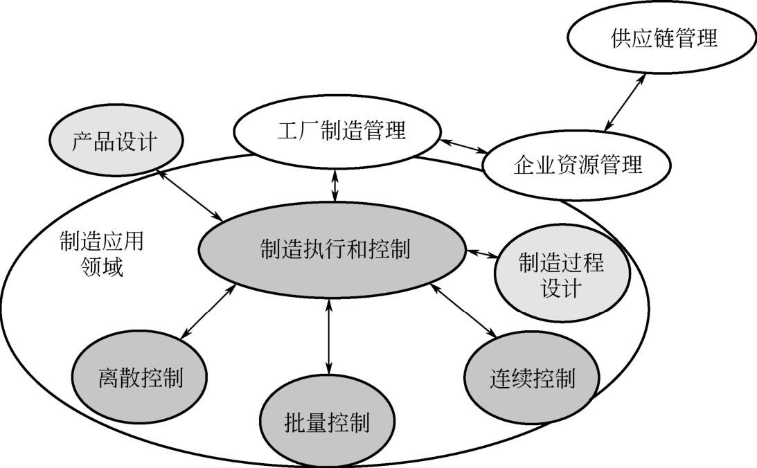 从纵向描述制造业企业的功能,可将企业功能划分为五层,如图2-5所示。从横向描述制造业企业功能,可以划分为工厂制造管理、产品设计、企业资源管理三个大的领域,如图2-6所示。