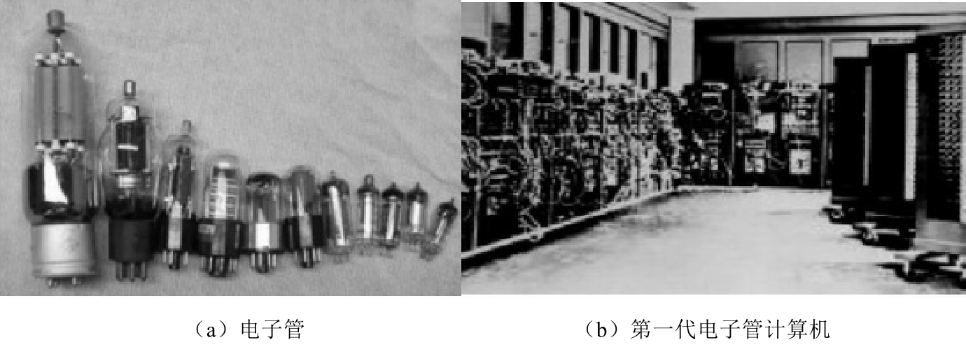 第一代基本元器件是电子管(见图2-1)。世界上第一台基于电子管的计算机——电子数字积分器与计算器(Electronic Numerical Integrator and Calculator,ENIAC)于1946年2月15日在美国宾夕法尼亚大学研制成功。ENIAC是为美国陆军进行新式火炮试验所涉及的复杂弹道计算而研制的,占地170平方米,重达30吨,耗电功率约150千瓦,每秒钟可进行5000次运算,这在现在看来微不足道,但在当时却是破天荒的。