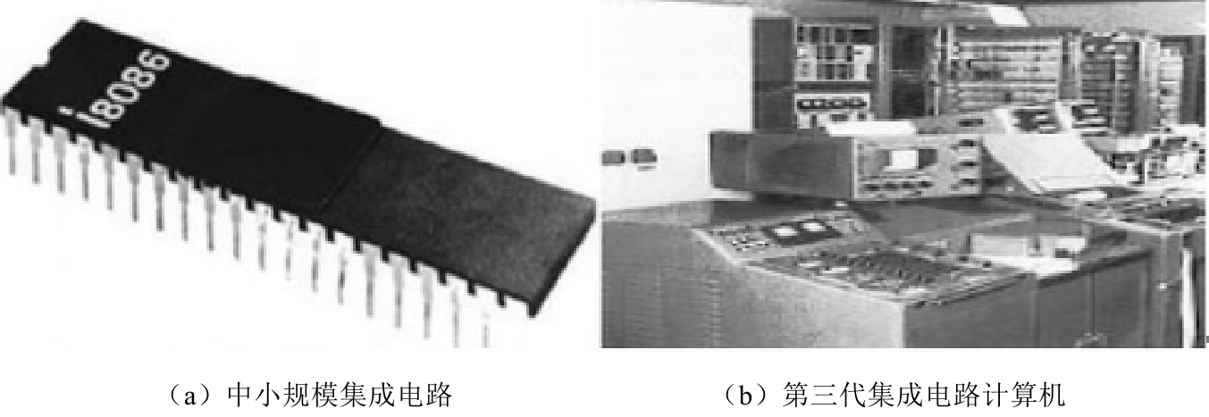 第三代是中小规模集成电路(见图2-3)。1958年,美国德州仪器公司(TI)的工程师杰克·基尔比发明了集成电路(Integrated Circuit,IC),而仙童公司的罗伯特·诺伊斯则提出了一种适合工业生产的集成电路理论。因为此项发明,杰克·基尔比于2000年获得了诺贝尔物理学奖。从1965年到1970年,集成电路被应用于计算机,因此这段时期被称为“中小规模集成电路计算机时代”。IBM公司花费50亿美元开发的IBM 360系列成为第三代计算机的代表。