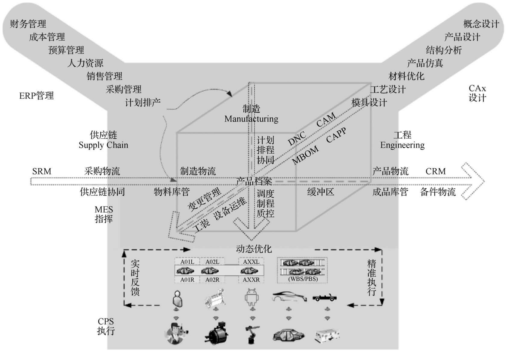 从制造业企业信息化的“Y”字型架构的角度,ERP 领域要适应大规模定制和服务转型的需要,要有一定的变化,细化成智慧工厂的制造执行(Manufacturing)维度和供应链(Supply Chain)维度。CAx领域要发生深刻的变化,数字孪生体(Digital Twin)将成为主体,CAx的四大重点领域CAD、CAPP、CAE和CAM将实现贯通,以数字孪生体为“统一”数据源,并在智慧工厂的工程(Engineering)维度实现D2M/M2D直至虚实融合工厂。