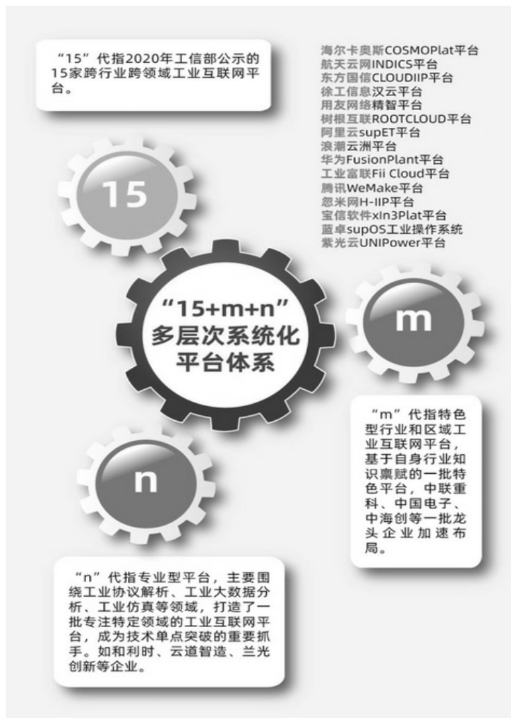 共享公共服务平台发展迅猛。国内工业互联网平台已有600余个,具备行业、区域影响力的超过70个,设备连接总数超过4000万台(套),工业 App 总数超过35万个,平台服务工业企业数近40万家。行业的综合应用向纵深发展,工业互联网已在家电、能源、钢铁等多个国民经济的重点行业成功应用。经过市场的不断筛选,工业互联网发展开始从求量转入求质的阶段,平台发展也从“百花齐放”进入“大浪淘沙”的阶段,多层次系统化的平台体系加速构建,“15+ m + n ”工业互联网平台体系如图3-17所示。