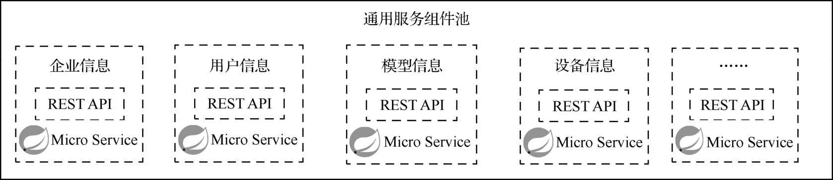 工业PaaS层以微服务、SDK组件等形式,提供物联设备接入、工业数据管理能力,工业PaaS层应用运行环境如图3-13所示。物联接入服务主要提供物联接入公共服务能力,以组件或微服务的形式提供物联接入平台级能力,包括设备管理、认证鉴权、设备模型管理、协议解析、数据处理、控制下发等核心服务管理功能。平台提供完善的工业数据管理服务能力,在端云两侧都具备可靠的数据融合能力。设备数据上云后,可依托工业时序数据库构建工业数据仓库,进行数据聚合分析。工业微服务将工具、算法、模型集成起来,封装成可独立调试运行的单一功能或服务模块,提升易用性和可维护性,通用服务组件池如图3-14所示。借助工业微服务并行开发、分布运行、资源隔离、灵活调用的特点,可有效发挥平台开发者接入、资源弹性配置、云化部署运行等优势,解决工业App所面临的快速运维、持续迭代、个性化定制等问题。