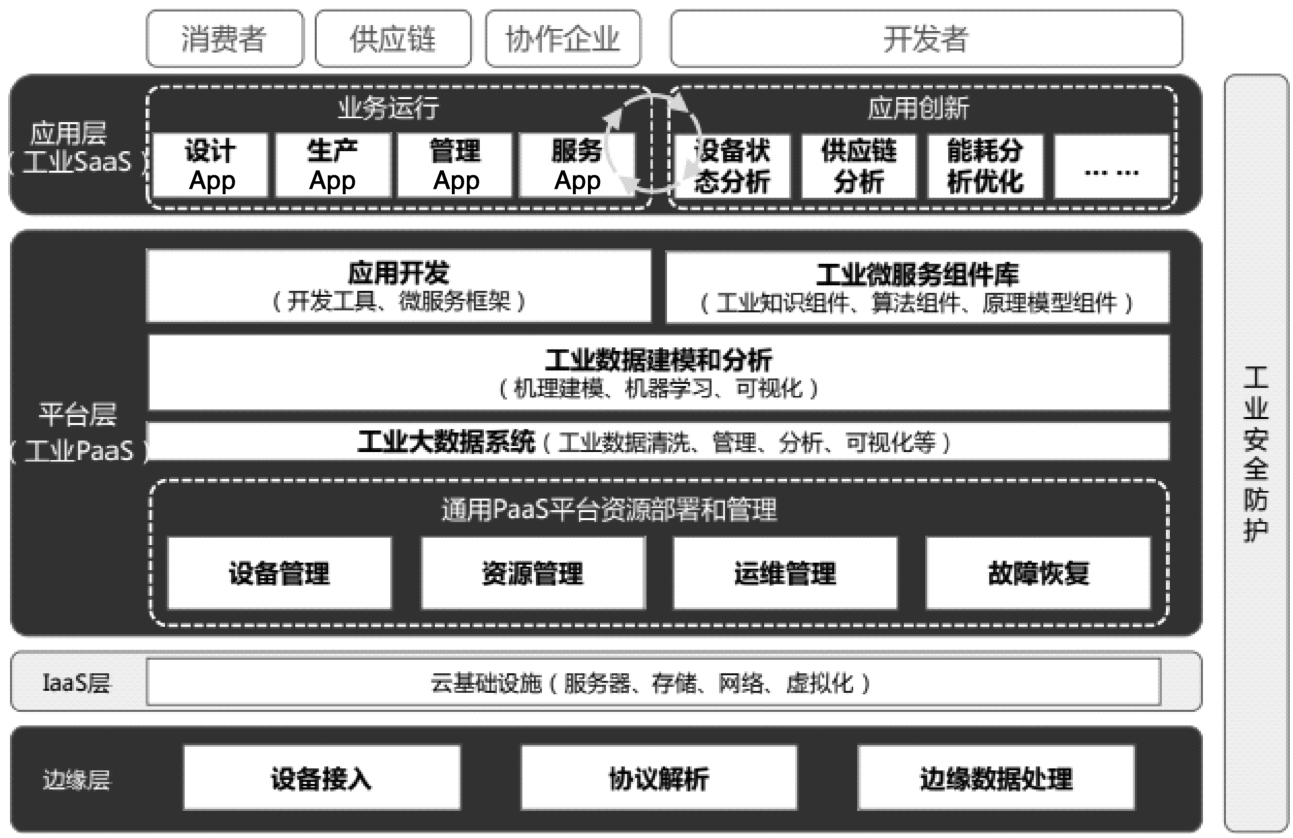 第四层是SaaS应用层:通过自主研发或者引入第三方开发者的方式,平台以云化软件或工业App的形式为用户提供设计、生产、管理、服务等一系列创新性应用服务,实现价值的挖掘和提升,形成工业互联网平台的最终价值。机械企业比较典型的SaaS服务主要以开发和实施装备制造企业营销、研发、制造、服务等SaaS应用系统为主,横向打通企业的全流程业务链,涉及设备管理、配置管理、云服务、指令下发、云视界、工业知识库管理、云营销、云研发、云制造、产品核价、供应链管理、流程引擎、数据分析等各类工业App。