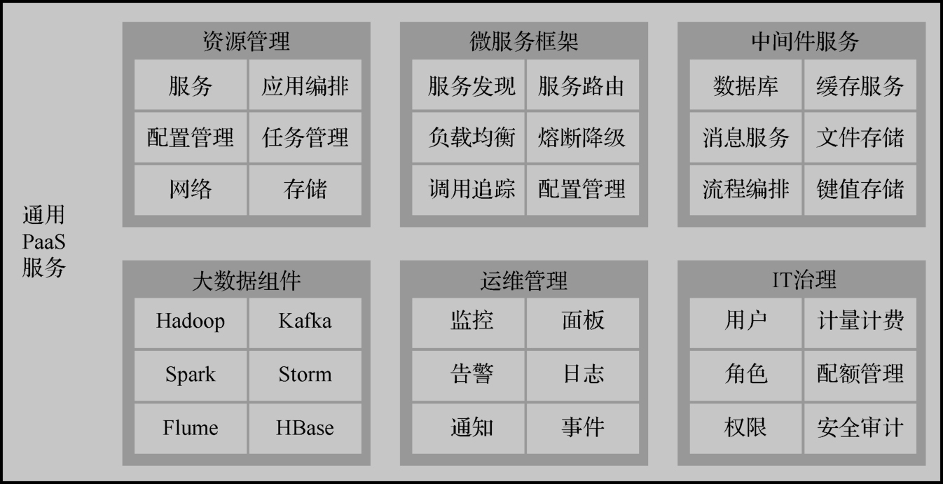 第三层是PaaS平台层:它是向外提供服务的基础,可以集中管理调度IaaS资源,提供快速开发框架、常用中间件及大数据组件,便于快速构建平台应用,同时提供运维管理工具和IT治理服务,通用PaaS服务结构如图3-11所示。PaaS平台层通过积累不同行业、不同领域内技术、知识、经验等资源,实现封装、固化和复用,叠加大数据处理、工业数据分析、工业微服务等创新功能,在开放的开发环境中以工业微服务的形式提供给开发者,工业PaaS层方案结构如图3-12所示。工业PaaS层可用于快速构建定制化工业App,降低应用程序开发门槛和开发成本,提高开发、测试、部署效率,构建可扩展的开放式云操作系统。