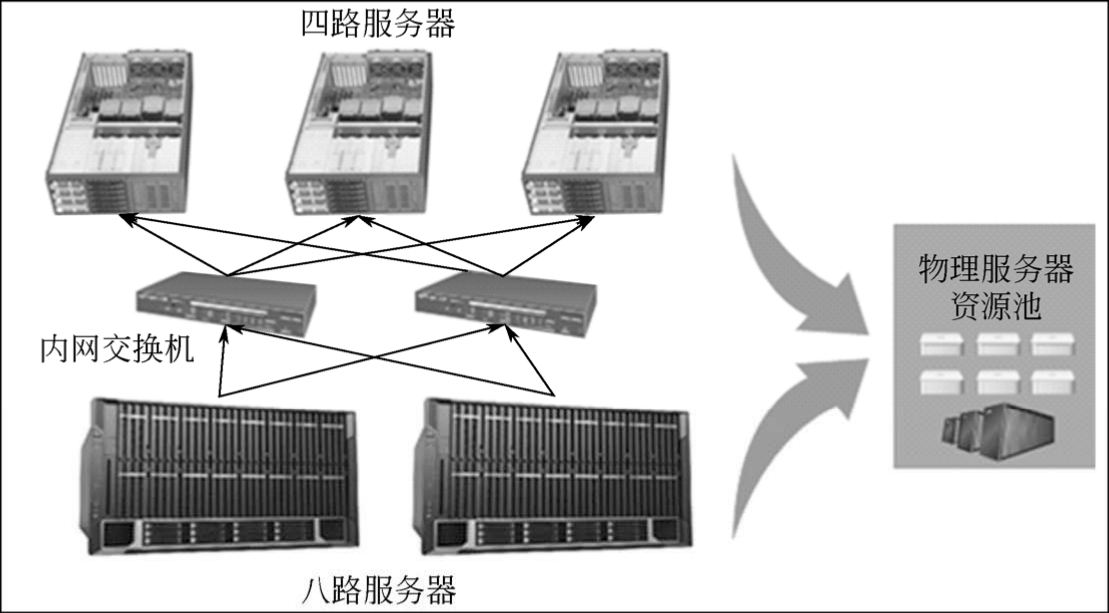 计算虚拟化资源池如图3-8所示,是由大量物理服务器组成的一个物理服务器集群,物理计算资源虚拟化后提供虚拟云服务。