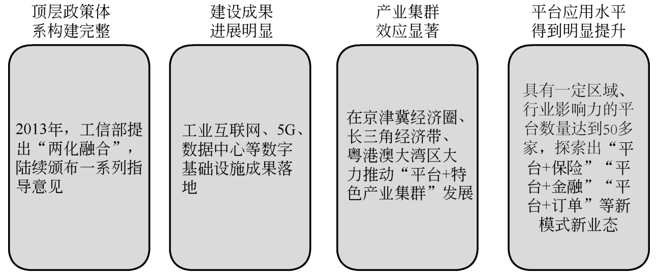 我国的工业互联网发展除借鉴国外的经验外,还具有深层次的发展动力。首先,人口红利消失和产业升级是其发展的根本动力。我国乃至全球都面临着劳动力锐减、人口老龄化的客观现实,在此背景下,要求制造业向智能化升级,使其朝着融合工业互联网的方向纵深发展。其次,新技术为其提供了基本条件,近年来随着我国制造业的智能化、工业信息化、工业技术的进步,外加其他技术的发展,如移动互联、大数据、人工智能、云计算、AR/VR等技术与制造业的广泛结合,工业互联网的核心技术逐渐成熟。最后,智能制造模式下,企业的新需求是工业互联网形成并获得发展的直接推动因素,制造业转型升级产生新的需求,这些需求直接推动了制造业与互联网的融合。经过多年的技术进步和市场培育,我国工业互联网发展现状如图3-1所示。