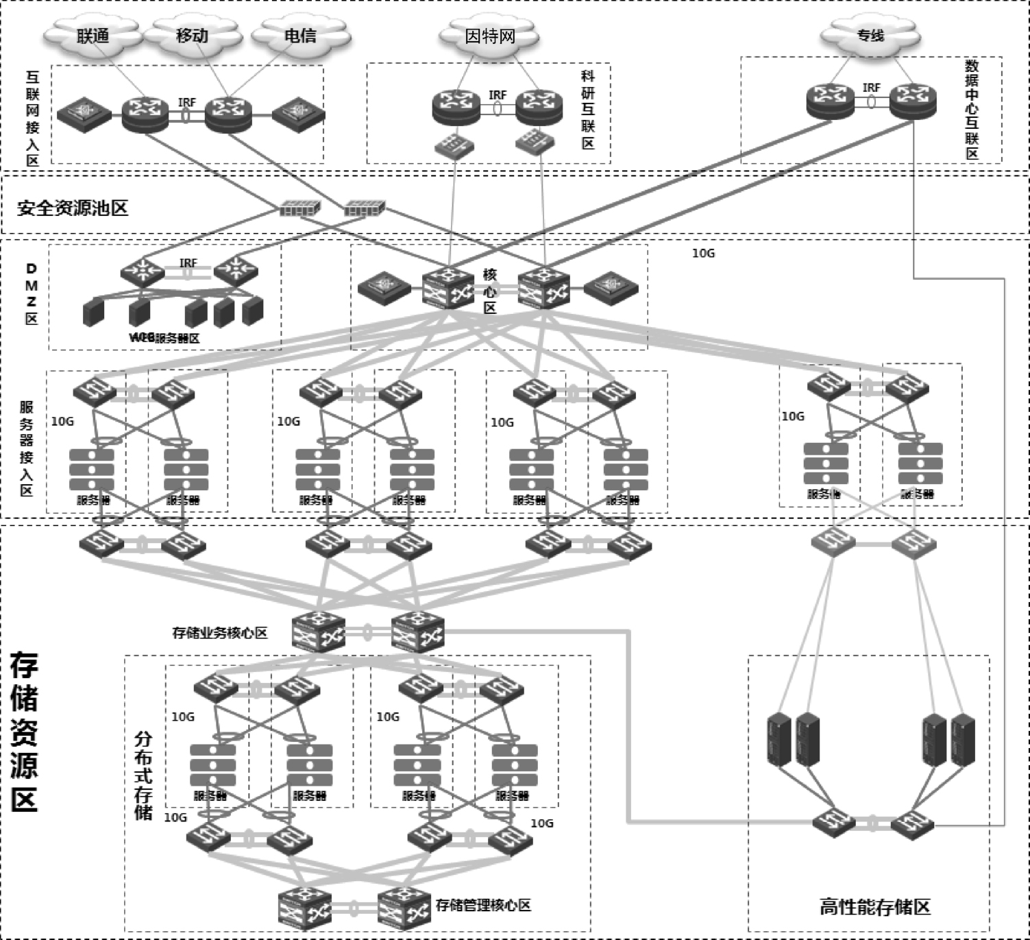 网络设计采用模块化分层分区设计思路,根据业务进行分区,包括服务器接入区、互联网接入区、数据中心互联区等。各区均采用双设备、双链路的冗余部署方式,避免网络单点故障。网络拓扑图示例如图3-10所示。
