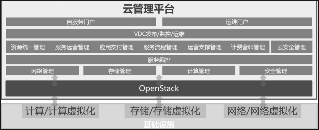 第二层是IaaS层:基于虚拟化、分布式存储、并行计算、负载调度等技术,实现网络、计算、存储等计算机资源的池化管理,根据需求进行弹性分配,并确保资源使用的安全与隔离,为用户提供完善的云基础设施服务。IaaS层整体架构如图3-7所示,包括计算虚拟化、存储虚拟化、网络虚拟化。