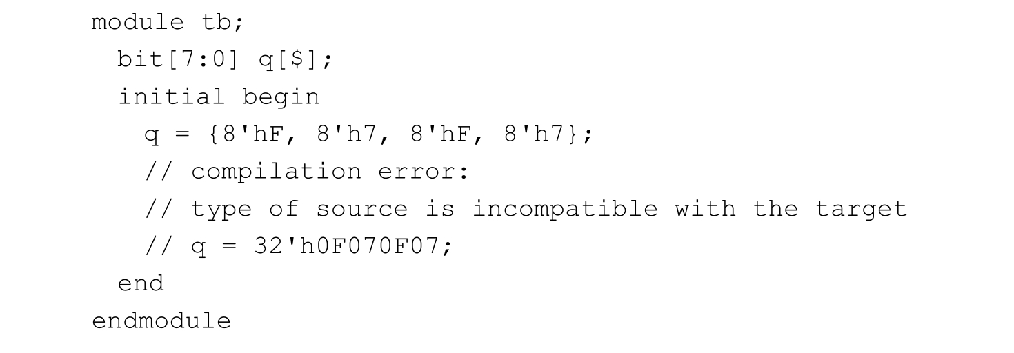 如果将一个向量赋值给队列,那么编译器会提示编译错误,即赋值等号两端的数据类型不匹配。这其实也告诉我们,不能将队列简单视为组合型数组,而且队列的数据也不是连续存储的。