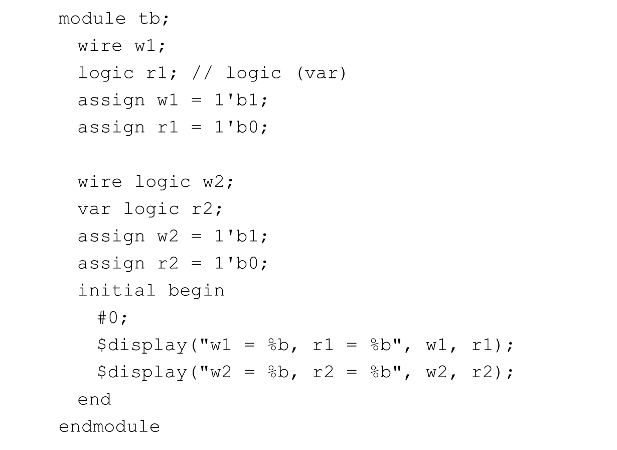 首先要明白,在SV中,类型可以分为线网(net)和变量(variable)。线网的赋值设定与Verilog的要求相同,即线网赋值需要使用连续赋值语句(assign),而不应出现在过程块(initial、always)中;相比于线网驱动的限制,变量(var)类型的驱动要求就没那么多了,如 logic[3:0]a ,该变量默认类型是var(变量),对它可以使用连续赋值或过程赋值。