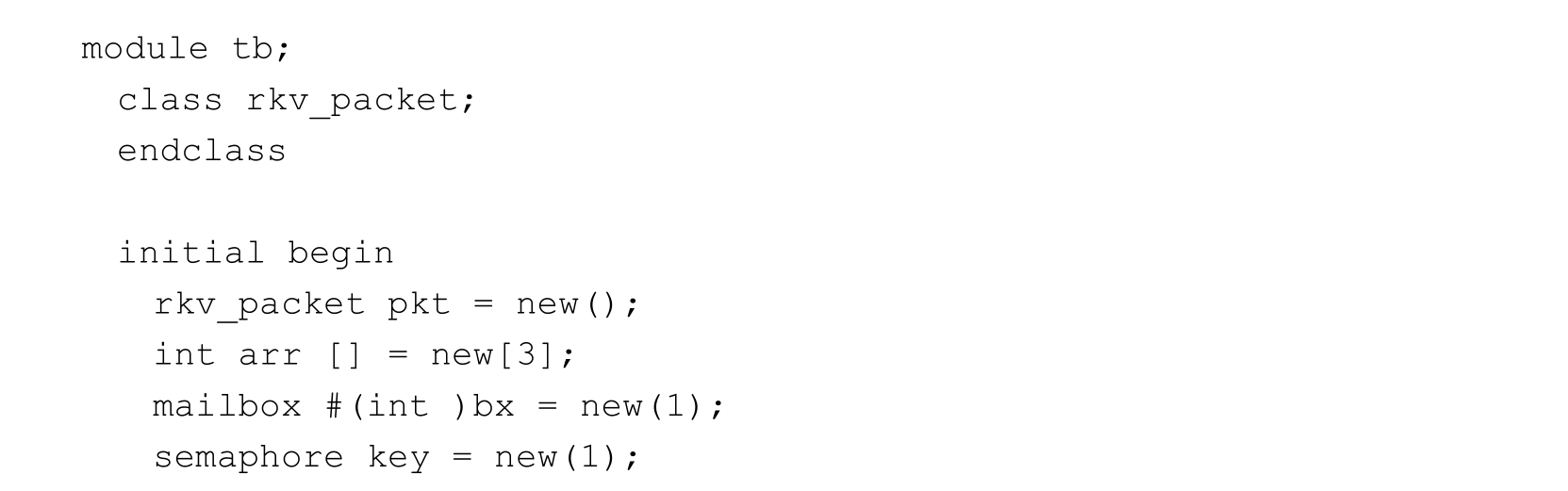 对于对象、旗语(semaphore)、信箱(mailbox),在创建时均需要 new() 函数,因此可以将旗语和信箱的实例也看成“对象”;对于动态数组,在重新开辟空间时(resize),需要 new[] 操作。注意,对象例化时使用的 new() 函数需要用小括号,而动态数组开辟空间使用的 new[] 需要用中括号。