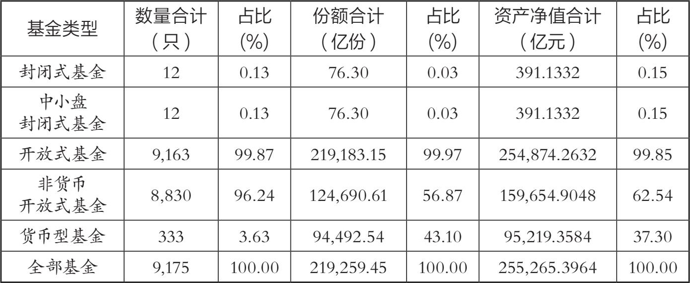 在我国基金发展的早期阶段,市场上基金产品基本上全部都是封闭式基金。但是随着 2001 年第一只开放式基金诞生之后,现在开放式基金已经成了我国基金市场的主流产品,见表 2-1。